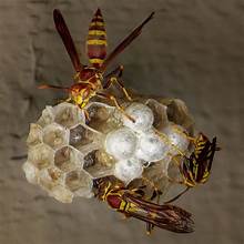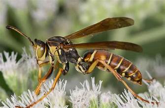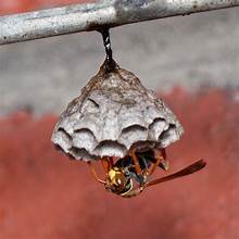 Paper Wasps: Paper wasps are 3/4 to 1 inch long, slender, narrow-waisted wasps with smoky black wings that are folded lengthwise when at rest. Paper wasps are usually brown with yellow markings on the head, thorax and bands on the abdomen The paper wasp nest is an open, umbrella-shaped structure built from a papery material made by the wasps. It is easy to spot because of its visible hexagonal cells. Paper wasps usually create their nests in protected areas to shield them from harsh weather.